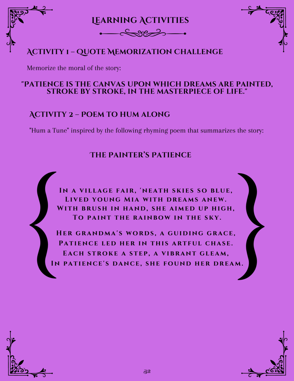 Crafted for children aged 5 and above, these stories aim to instill essential virtues while cultivating a passion for storytelling, creativity, and self-reflection. Each tale is enhanced with a brief rhyming poem and an insightful quote, reinforcing the core moral or virtue. This approach helps young readers comprehend and internalize the lessons, serving as gentle reminders that virtues are not abstract ideals but practical guidelines for leading a purposeful and meaningful life.